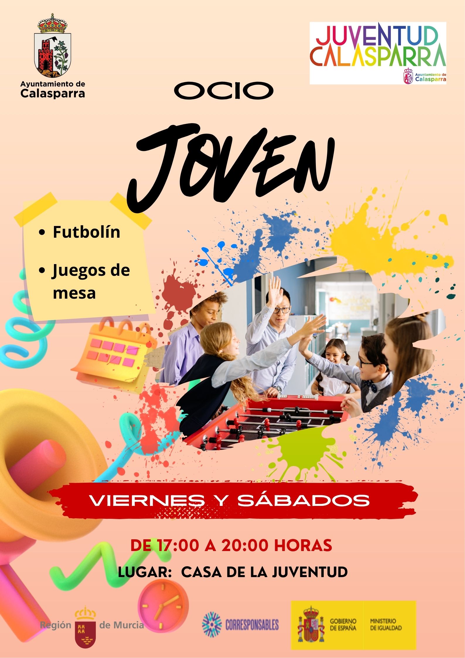 Desde la Concejalía de Juventud del Ayuntamiento de Calasparra se pone en marcha una nueva iniciativa de ocio dirigida a los jóvenes del municipio. Bajo el nombre Ocio Joven, esta propuesta ofrece un espacio dinámico y acogedor en la Casa de la Juventud, donde podrán disfrutar de forma gratuita de actividades como futbolín y juegos de mesa.
